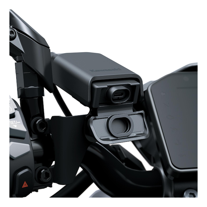 Prise USB-C étanche logée sur le guidon pour Kawasaki Z1100 (2026).Accessoire Plug & Play monté de série sur les versions SE.