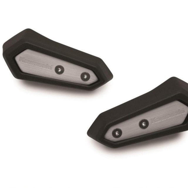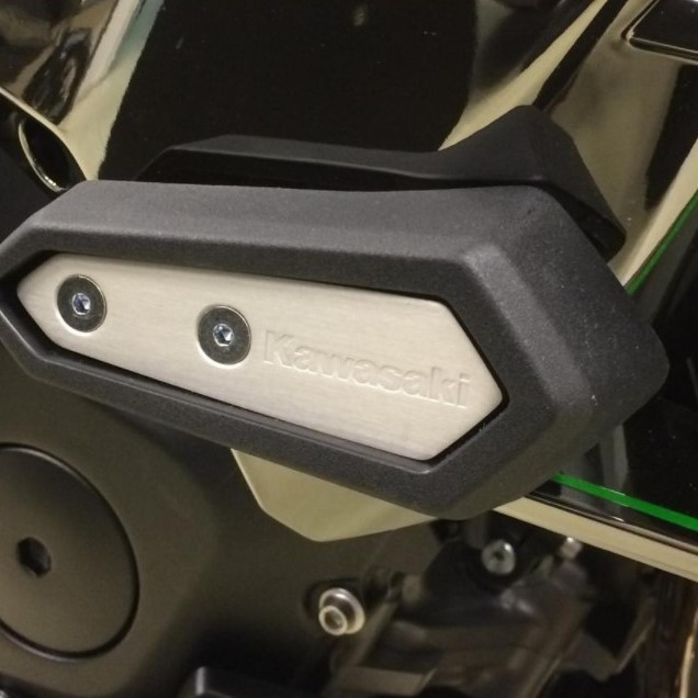 Pour le style, les patins de protection reçoivent un insert réalisé en aluminium contenant le logo Kawasaki. De toute beauté !