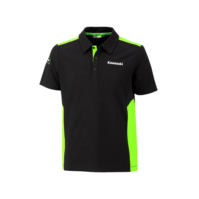 Logos Kawasaki imprimés sur le devant et à l'arrière, écusson brodé sur l'épaule de la manche droite, il profite également d'empiècements verts sur les épaules et les flancs et d'une fabrication 72% coton et 28% polyester.