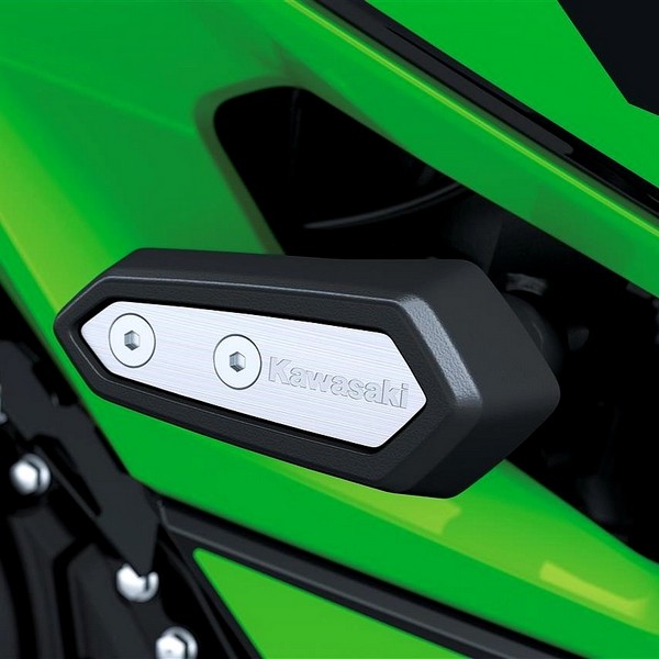 Kit patins de protection protège-carters avec insert en aluminium et logo Kawasaki permettant de protéger les parties latérales de votre moto en cas de chute.