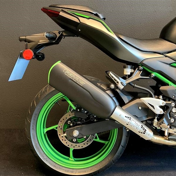 Silencieux Sport Remus finition noire avec liseré argenté pour Kawasaki Z500 (+SE) et Ninja 500 (+SE) (2024-2025).