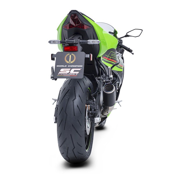 Le silencieux SC Project CR-T, multiple Champion du Monde en catégorie MotoGP et Moto2, rend la Ninja ZX-6R (2024-2025) plus agressive que jamais.